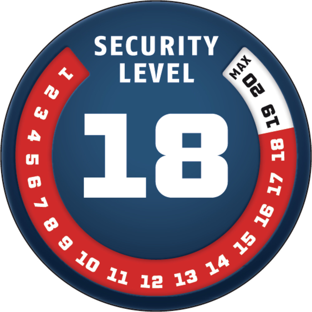 Het merk ABUS hanteert voor zijn sloten het Security Level-systeem. Dit beveiligingsniveau werkt op een schaal van 1-15 voor fietssloten en tot Level 20 voor motorsloten. ABUS heeft dit beugelslot ingeschaald op Security Level 18.