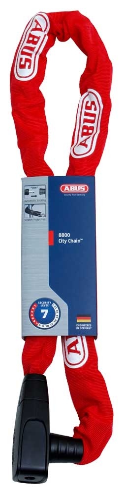 De City Chain 8800 van ABUS is een rood kettingslot van 95 centimeter lang. Deze lengte maakt het mogelijk om uw fiets te bevestigen aan de meest gangbare objecten op straat, zoals een lantaarnpaal of hek. Het slot weegt ongeveer 1000 gram en is een prima kettingslot voor het op slot zetten van uw fiets. Op de veiligheidsschaal van ABUS wordt dit slot ingeschaald op level 7.