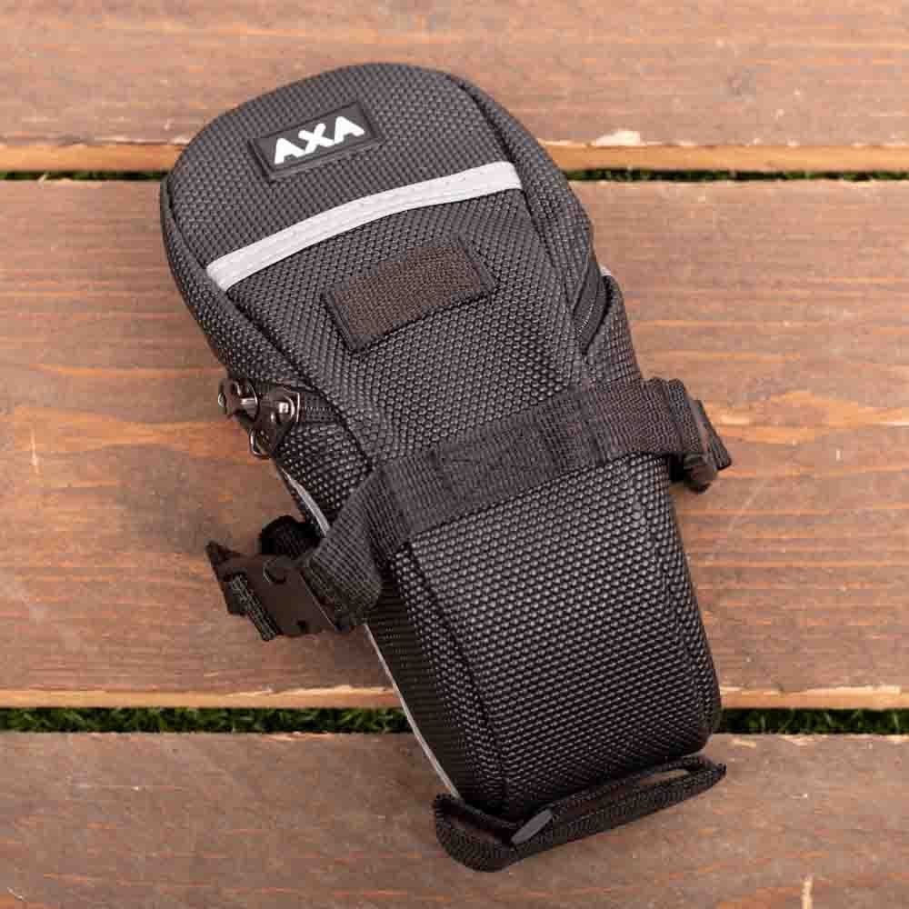 Een praktische set voor het beveiligen van een fiets, bestaande uit een ringslot AXA Imenso X Large, een ULC 130 insteekketting en een handig zadeltasje waarin de insteekketting opgeborgen kan worden tijdens een fietsrit.
