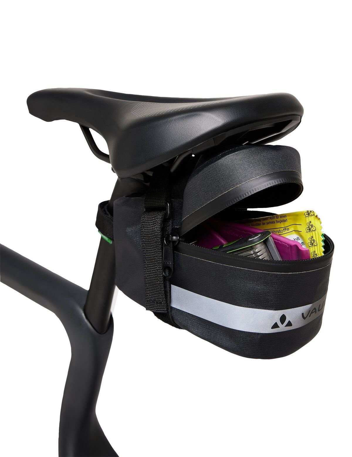 Het zadeltas is gemakkelijk onder het zadel en aan de zadelpen te bevestigen met twee klittenbandsluitingen.